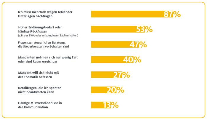 Sie schreiben E-Mails, rufen an – und hören oft tagelang nichts, benötigen aber dringend ein Gespräch mit dem Mandanten. 40 Prozent der Community geben an, dass das eine große Herausforderung ist. Natürlich kann es bei Ihrem Mandanten mal stressiger werden und dazu führen, dass er schlecht erreichbar ist. Ist das allerdings häufiger der Fall, können Sie Ihre Arbeit im schlimmsten Fall nicht abschließen.