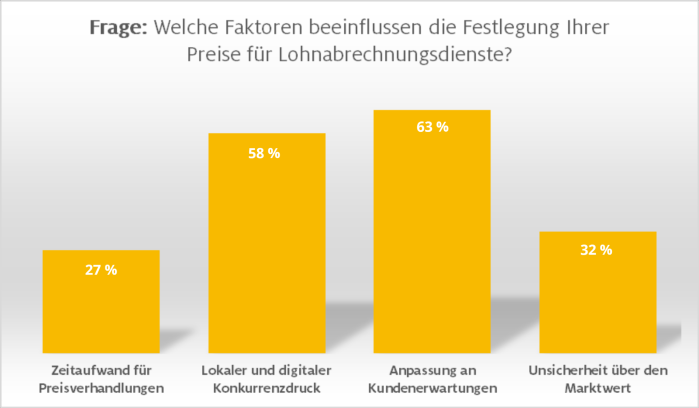 Welche Faktoren beeinflussen die Preisgestaltung bei der Lohn- und Gehaltsabrechnung? Die zahlreichen Antworten selbstständiger Buchhalter ergeben ein vielschichtiges Bild (Mehrfachantworten waren möglich), aus dem sich einige Schlüsselerkenntnisse ableiten lassen.